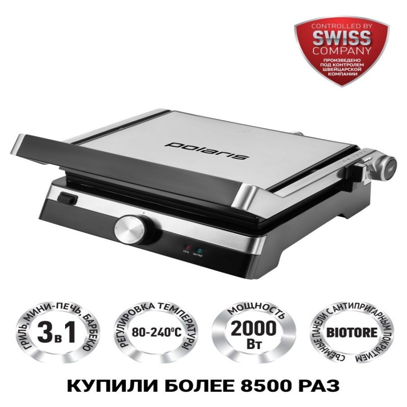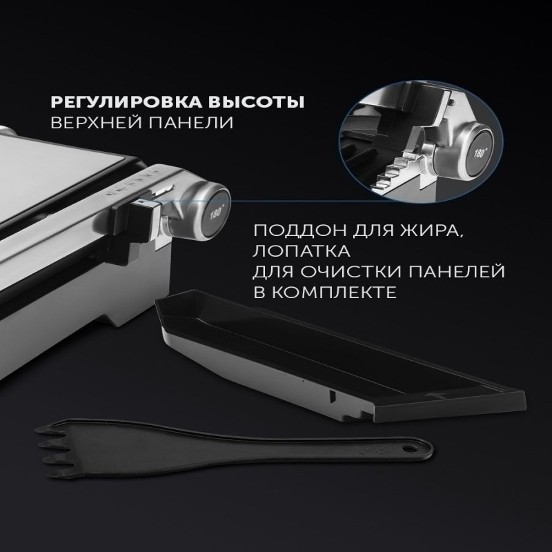 3 в 1: Гриль, Печь, Барбекю. Регулировка температуры - от 80 до 240 градусов. 2 съемные панели с антипригарным покрытием BIOTORE. Плавная регулировка температуры. Возможность использования в открытом положении. Рабочие поверхности раскрываются на 180 градусов. Кнопка высвобождения панелей для удобства использования. Рифленые панели способствуют равномерной прожарке. Рабочие поверхности имеют каналы для стекания жира в поддон. Лопатка для очистки панелей в комплекте. Регулировка высоты верхней панели. 2 индикатора работы. Поддон для жира.
