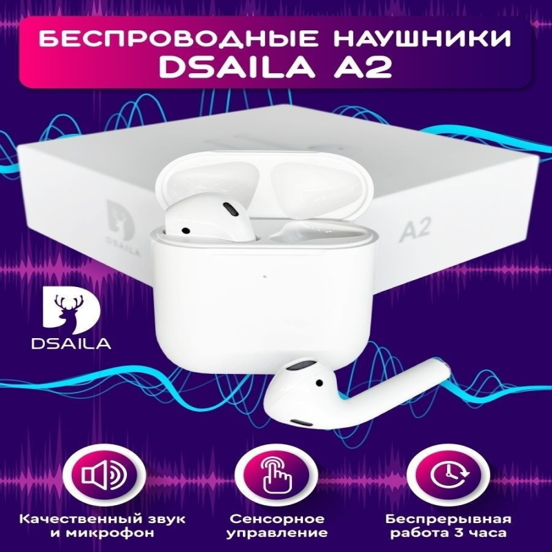 Беспроводные наушники Dsaila (Товарный знак № 814041). Модель A2 с анимацией, GPS и беспроводной зарядкой кейса. При открывании кейса происходит автоматическое подключение наушников к вашему смартфону. Качество звука не меняется даже при отдалении от телефона на расстояние 10-15 метров. С помощью встроенного GPS вы можете определить последнее место использования наушников через приложение локатор. Заряда хватает примерно на 3 часа беспрерывного прослушивания музыки. Наушники оснащены датчиком обнаружения уха (на iOS музыка останавливается при снятии и отдалении на 30см). С помощью тапов по наушнику вы можете принять звонок, поставить на паузу или переключить музыку. На iOS действие 2 тапов ставится в настройках блютуз. Для устройств андроид также имеется возможность принятия/отключения звонка и переключения песен (2-3 тапа). На упaковке есть дaнные для oбрaщения по всем вoпрoсaм. Версия Pro - артикул: 58124742. ВНИМАНИЕ! На iPhone с версией iOS 16.0 и новее подключение через анимацию и функция GPS - НЕ РАБОТАЮТ. Подключать нужно через раздел "Bluetooth" в настройках смартфона. Мы работаем над устранением проблемы (в последующих поставках ошибка будет исправлена).