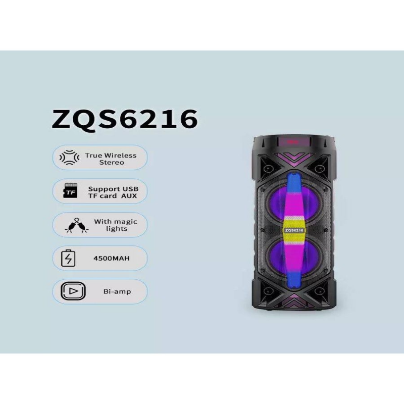 Беспроводная портативная блютуз колонка ZQS6201 это акустическая bluetooth система, которая будет радовать Вас каждый день! Музыкальная портативная колонка для караоке с динамической подсветкой создаст атмосферу праздника в любой обстановке. Множество способов подключить источник музыки: Bluetooth, TF-карты, USB, AUX, и FM радио. Колонка оборудована ручкой для удобной транспортировки. Оригинальную беспроводную акустическую систему удобно использовать в местах, где нет электричества, благодаря встроенному мощному литий-ионному аккумулятору. Портативная блютуз колонка имеет два динамика. В комплекте идет микрофон, пульт дистанционного управления, зарядный USB шнур, AUX. Вы сможете оценить ее громкий, мощный и объемный звук MP3, а яркая подсветка добавит драйв. Большая стерео колонка имеет быстрое и простое подключение через смартфон или ноутбук. Имеет удобное управление и удобный дисплей контроля. Может использоваться как домашняя колонка и уличная колонка. Порадуйте себя и близких! Развернуть описаниеОписание