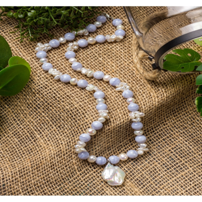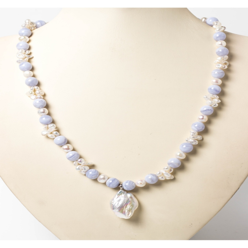 НОВИНКА! Представляем вашему вниманию изящное колье из голубого бразильского агата и жемчуга Барокко. Изысканное и очень нежное, оно украсит шею своей владелицы. Красивый самоцвет напоминает утонченные воздушные кружева. Это украшение отличается утонченностью и благородством. Длина изделия - 57 см. Размер камней - голубой агат - 10 мм. Размер подвески из жемчуга Барокко - 3х2 см. Замок - карабин, выполнен из серебра 925 пробы.