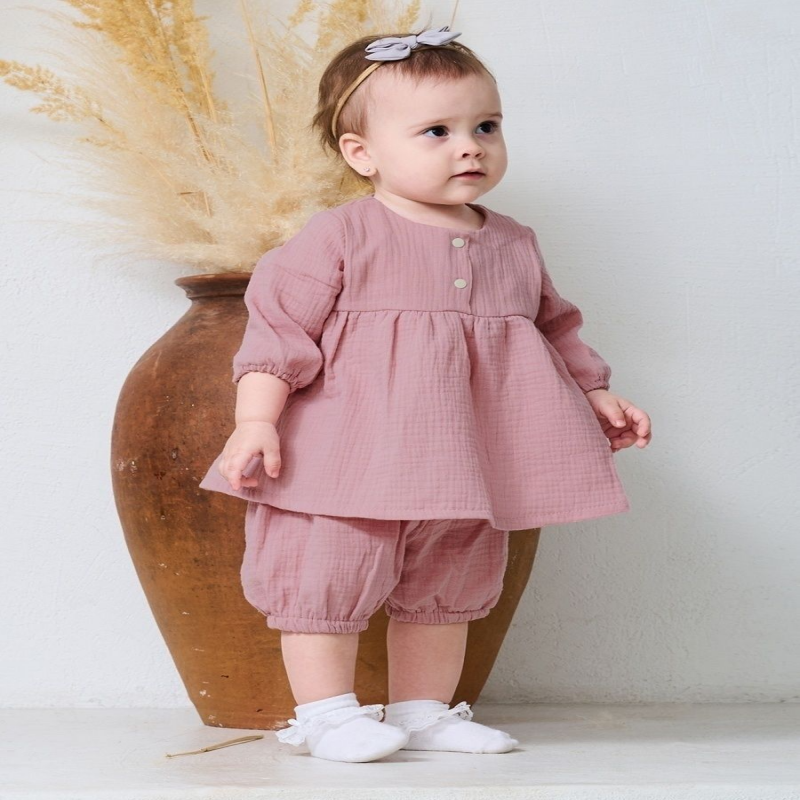 Purpose | Newborn beach tunic with shorts; Newborn girl muslin dress; Girl's muslin suit as a gift |