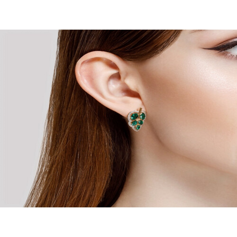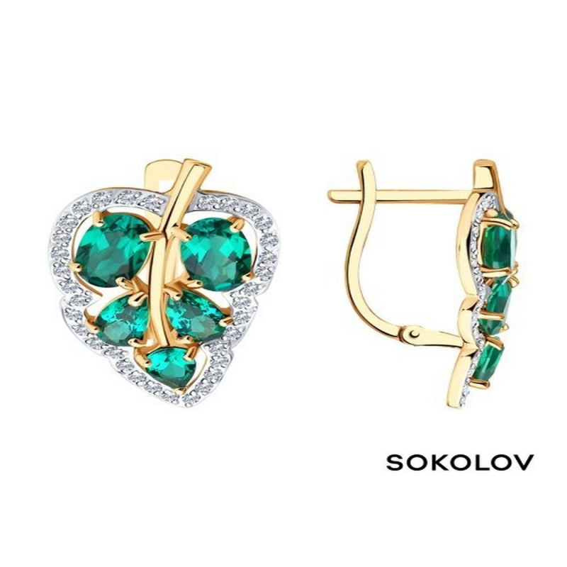 Women's gold earrings of an unusual shape with emeralds and cubic zirconia. Stylish designer earrings with a classic English clasp are perfect for everyday wear and will also effectively complement a dressy, evening, holiday, or wedding look. These modern jewelry pieces easily complement any outfit. SOKOLOV jewelry comes gift-wrapped and is ideal as a gift for a loved one, girlfriend, or girl for a birthday, New Year's, March 8th, Valentine's Day (February 14th), or any holiday or occasion. The weight values in the photo and specifications are approximate and may differ from the actual weight. This item is made of 14k red gold. Insert: emerald, cubic zirconia.